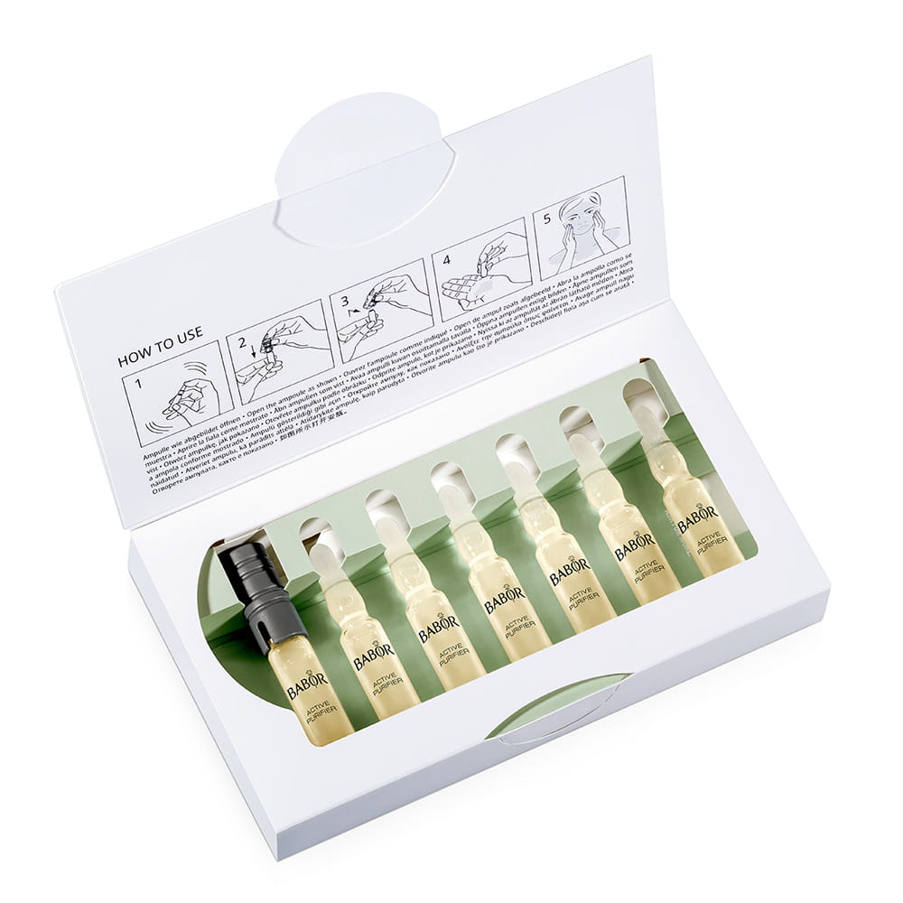 Nach der Reinigung mit BABOR CLEANSING-Produkten. Ampulle schütteln und den Ampullenhals mit einem Kosmetiktuch oder dem beiliegenden Ampullenöffner bedecken. Ampulle am Ampullenhals bzw. Öffner anfassen und mit einer ruckartigen Bewegung am unteren, farbigen Ring aufbrechen. Fluid in den Handteller geben und dann auf Gesicht, Hals und Dekolleté verteilen. Sanft in die Haut einklopfen. Anschließend Pflegecreme auftragen.