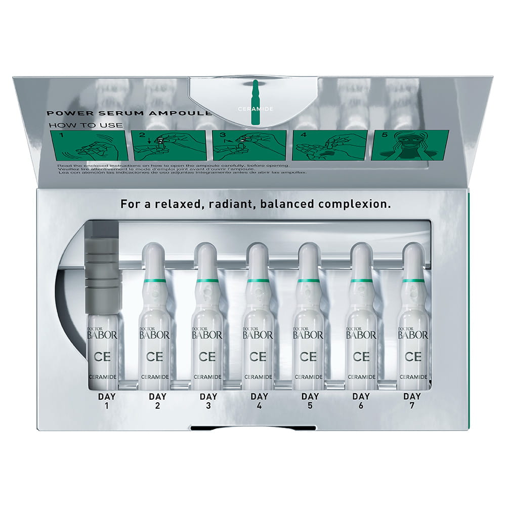 Nach der Reinigung mit BABOR CLEANSING-Produkten. Ampulle schütteln und den Ampullenhals mit einem Kosmetiktuch oder dem beiliegenden Ampullenöffner bedecken. Ampulle am Ampullenhals bzw. Öffner anfassen und mit einer ruckartigen Bewegung am unteren, farbigen Ring aufbrechen. Konzentrat in den Handteller geben und dann auf Gesicht, Hals und Dekolleté verteilen. Sanft in die Haut einklopfen. Anschließend Pflegecreme auftragen.
