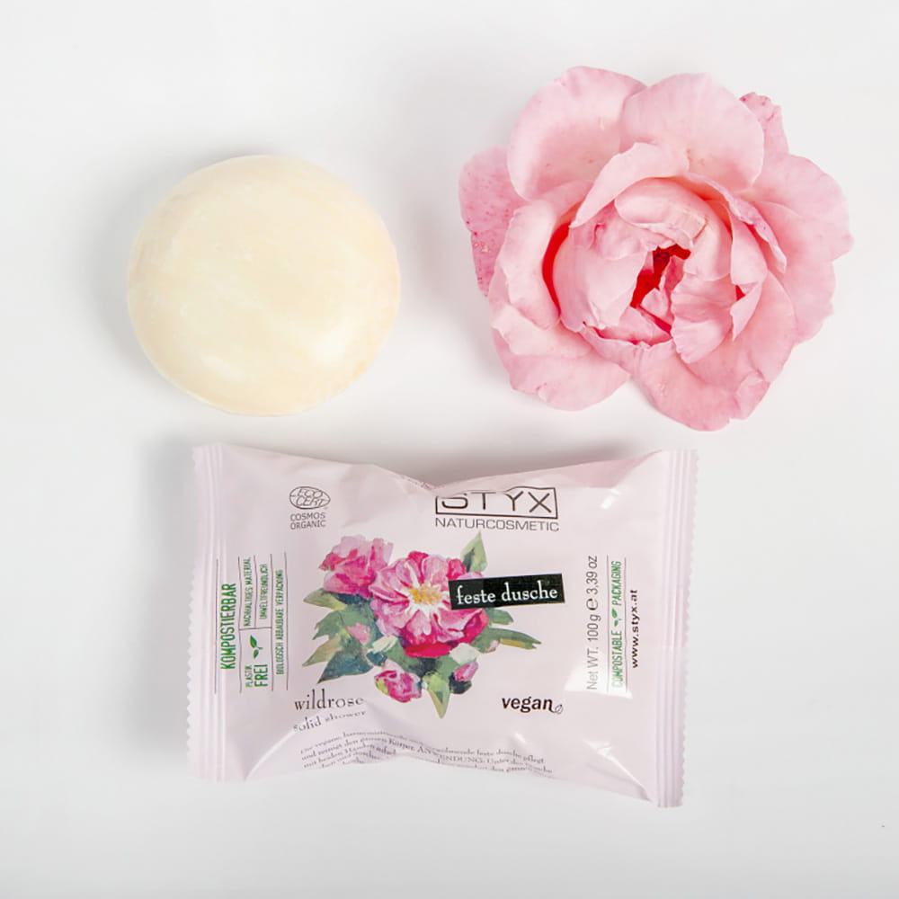 Die handgemachte feste Dusche von STYX Naturcosmetic mit Rosenöl verwöhnt und harmonisiert Ihren Körper beim Duschen und Waschen.Pflegen Sie sich mit dem cremigen und traumhaft duftenden Schaum der biologisch abbaubaren festen Dusche mit Wildrose.Zudem hinterlässt die Rezeptur mit zertifizierter Seifenbasis und BIO Glyzerin ein gepflegtes Hautgefühl und verwöhnt die trockene Haut mit einem natürlichen Hautschutz.Obendrein ist die exklusive Pflegeformel der Naturkosmetik frei von künstlichen Farb-, Duft und Konservierungsstoffen.Die neue innovative und umweltschonende Verpackung ist aus kompostierbarer Folie, die im BIO-Hauskompost entsorgt werden kann. Innerhalb von ca. 15 Wochen zersetzt sich die Folie vollständig.